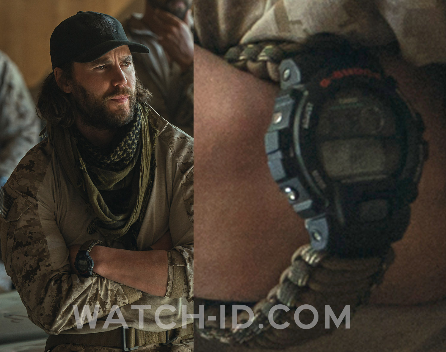 The classic Casio DW-6900-1VQ watch worn in The Terminal List: Dark Wolf has a black case, grey button, red G-SHOCK logo. Taylor Kitsch wears the Casio watch on a braided 'paracord' strap.