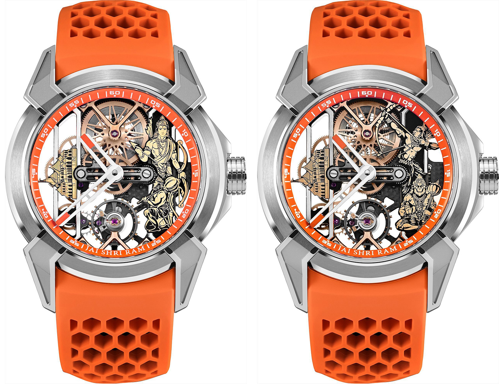 There are three versions of the watch: the 'standard' EX110.20.AO.AA.A Skeleton watch and two special 'Indian' editions: Jacob & Co. Epic X Ram Janmabhoomi Titanium Edition 1 Ref. EX110.20.AA.AR.ABRUA and EX110.20.AA.AS.ABRUA, both featuring the Ram Mandir in Ayodhya, Uttar Pradesh, India, along with motifs of Lord Ram and Lord Hanuman.