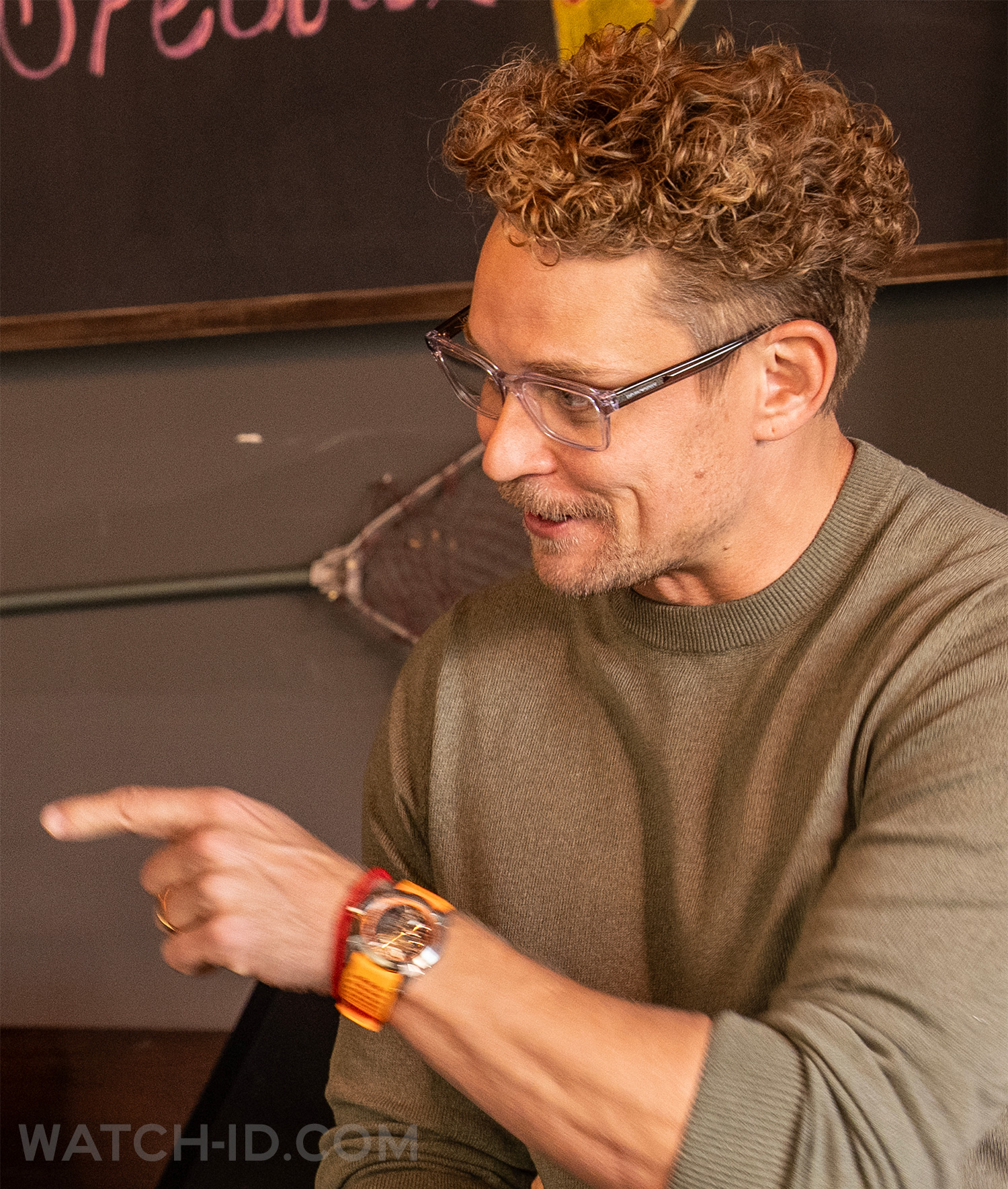 Billy Magnussen wears a Jacob & Co. Epic X Skeleton watch with orange details and orange strap in the AMC series The Audacity (2026).